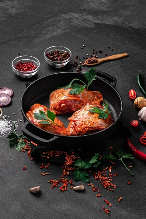 Полуфабрикат из мяса птицы цыплят-бройлеров мелкокусковой мясокостный охлажденный Бедро в маринаде